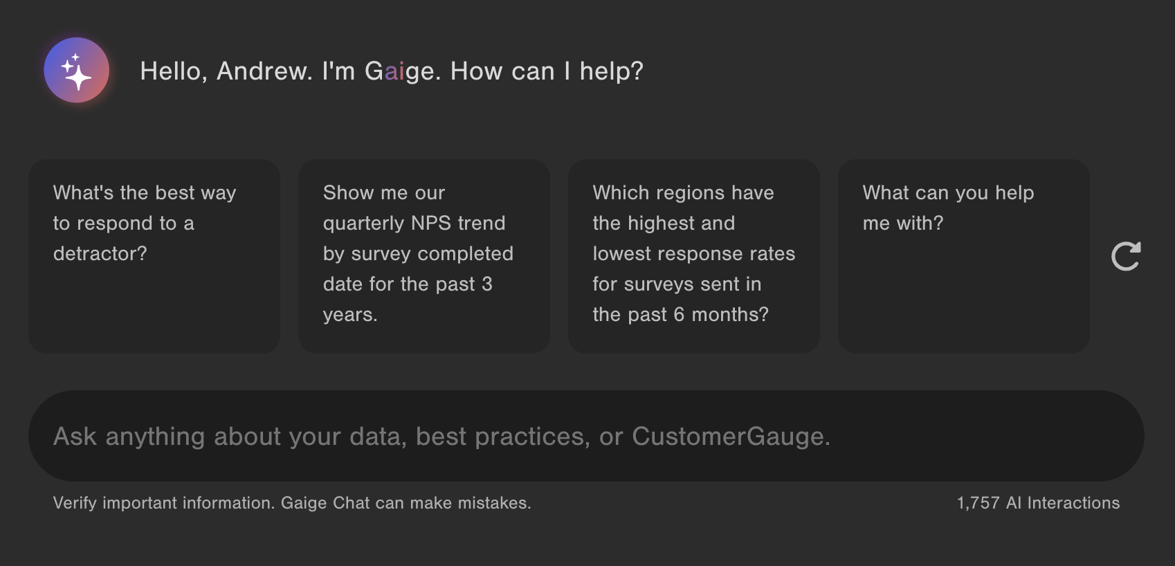 Try it out by asking Gaige “What was the most selected NPS score from surveys sent in 2025?”