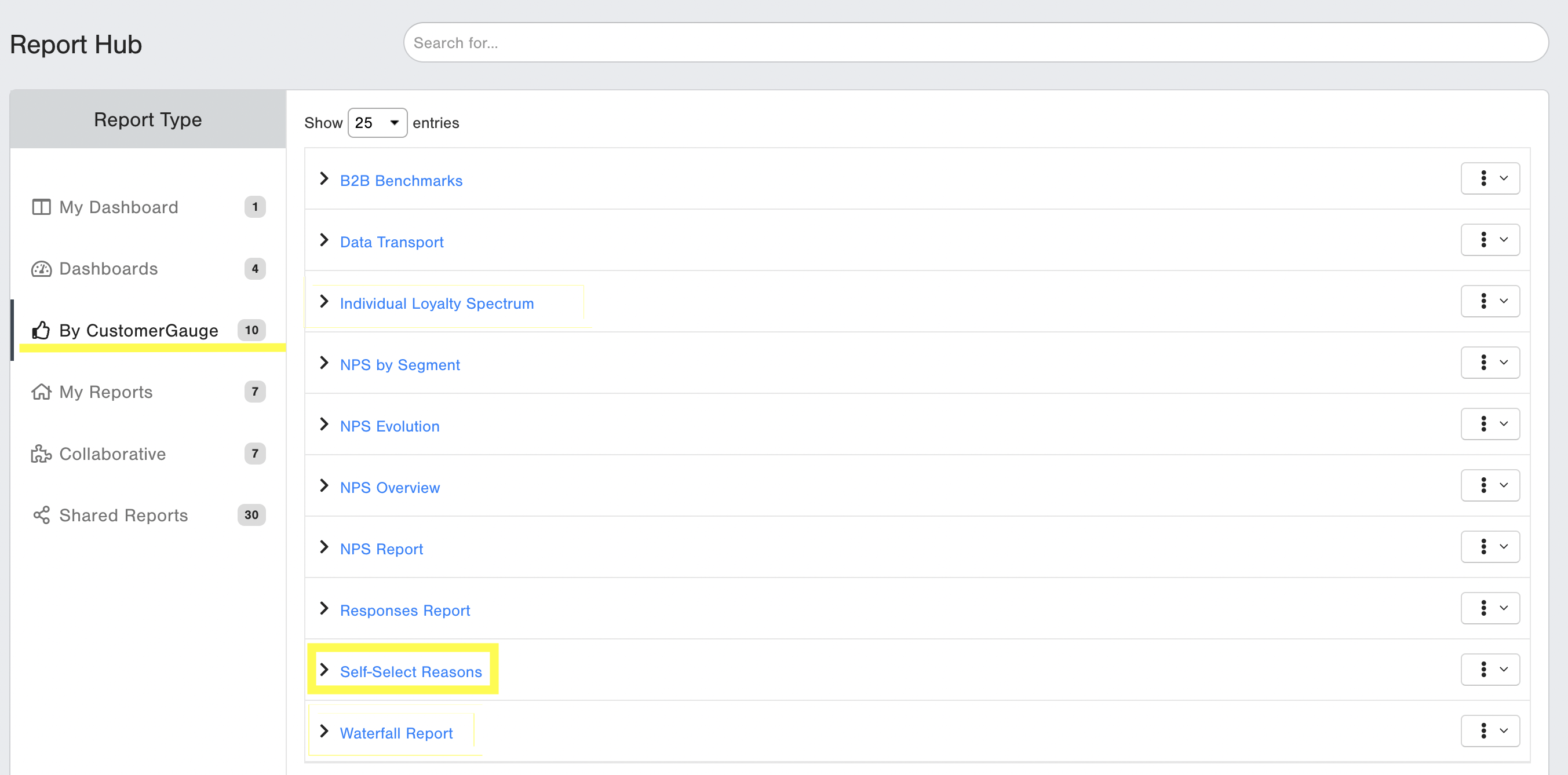 The Self-Select Reasons Report can be accessed from the menu under Reports > By CustomerGauge. Click on Self-Select Reasons report name or View button in the action drop down to open the report. Please note: The standard reports are not editable. If you do want to do that, you can make a Copy of the report. The copied report will be shown under the My Reports tab on Report Hub.