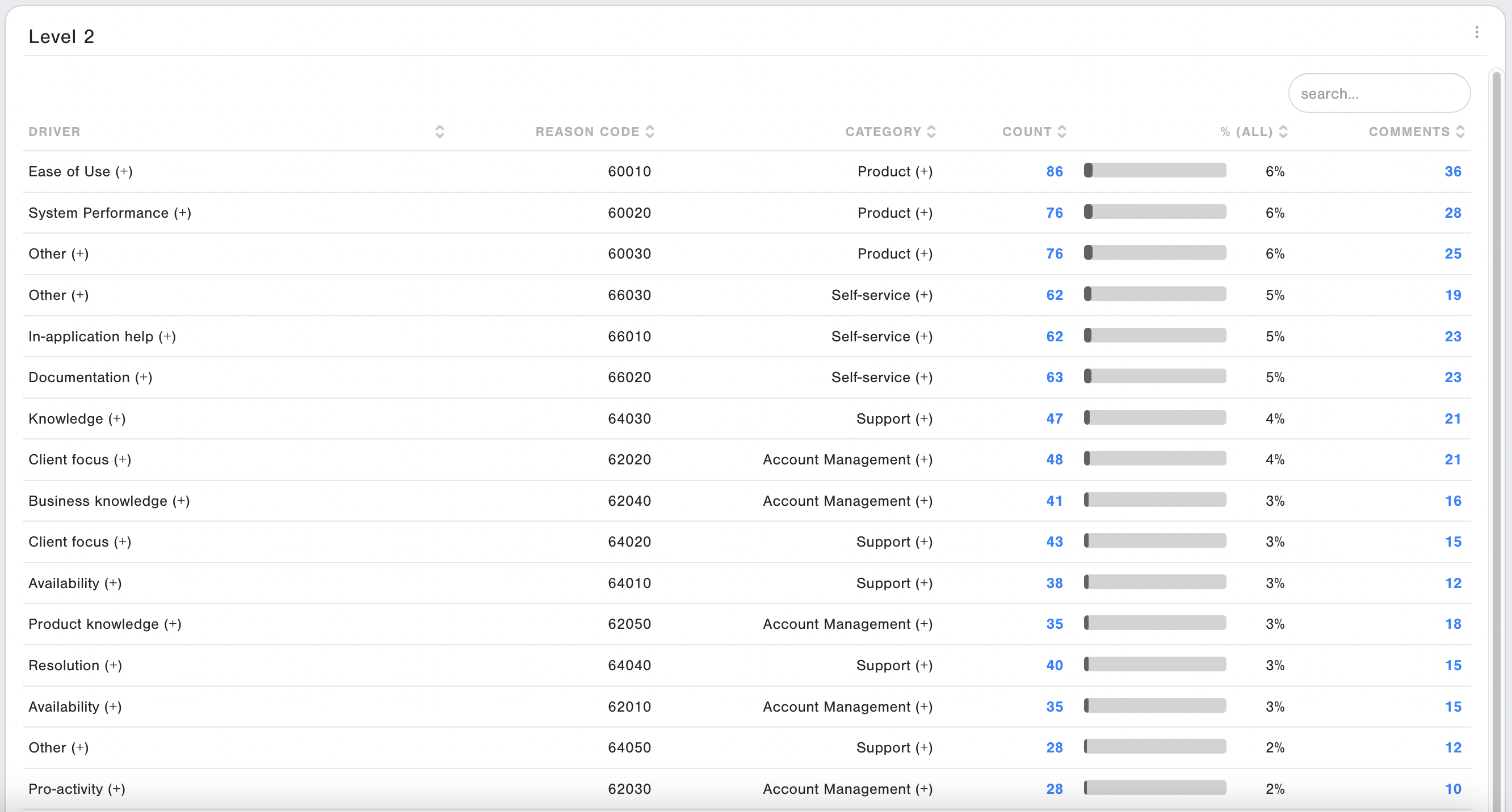 The Level 2 table gives an overview of all sub-categories that have been selected by the respondents. The column % (All) shows the percentage of Level 2 self-select issues compared to all (Level 1) reasons. Just as in the Level 1 table, you can drill down on the blue numbers to view the list of responses.
