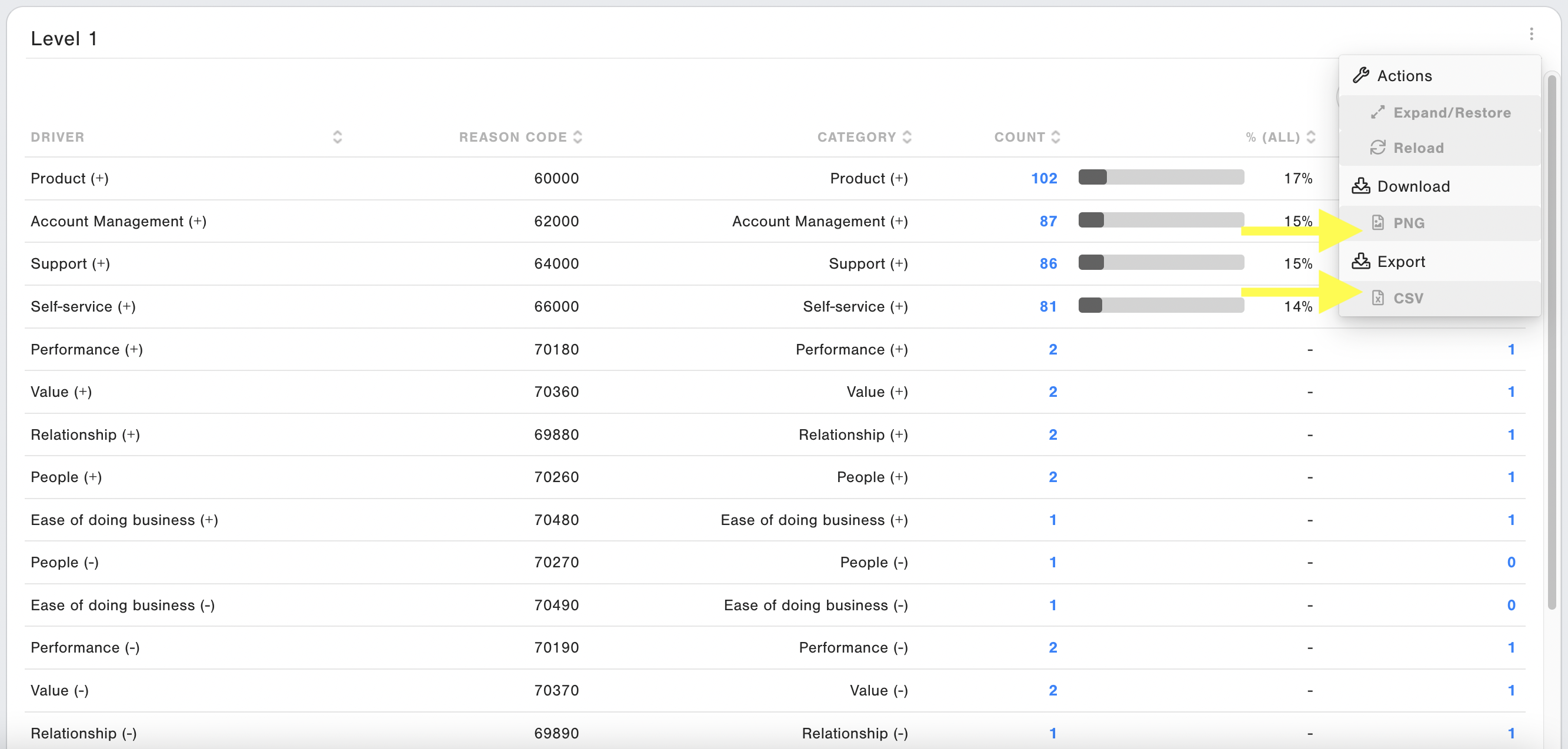 The Level 1 table gives an overview of all main categories that have been selected by the respondents. You can drill down on the blue numbers to view the list of responses. And as on all our tables, you can export as CSV or PNG and click on the headers to sort the columns.