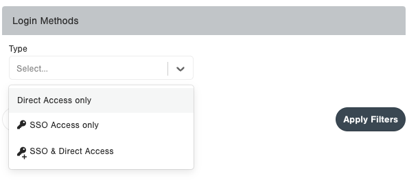 You can use the Login Methods “Type” filter to find users that are able to log in with Direct Access, Single Sign-On, or both. As a System Administrator looking to Bulk Revoke Direct Access, you’ll need to filter on "SSO & Direct Access" first.