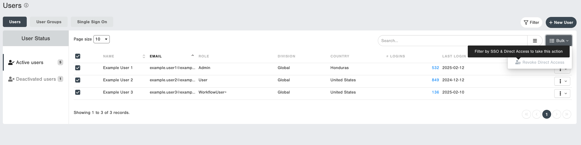 - Bulk Actions: After selecting the checkbox of one or more users, you can take actions to the selected users, such as Activate/Deactivate, or, as a System Administrator, Revoke Direct Access.