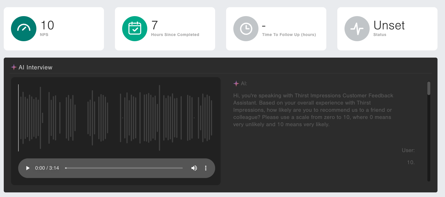 If a response has been submitted by a Gaige AI Interview Survey, you will see an extra box on this page containing the call recording and transcript.