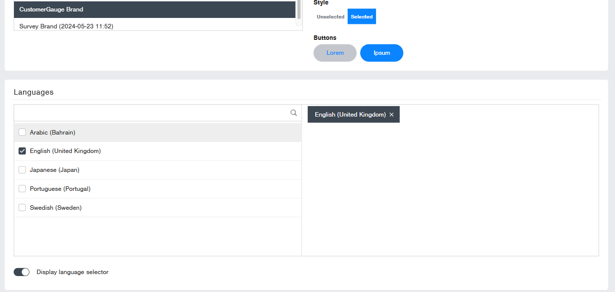 3. Languages: You can choose one or more languages that you want your Survey to be presented in. A list of all supported languages in CustomerGauge Surveys can be found here.