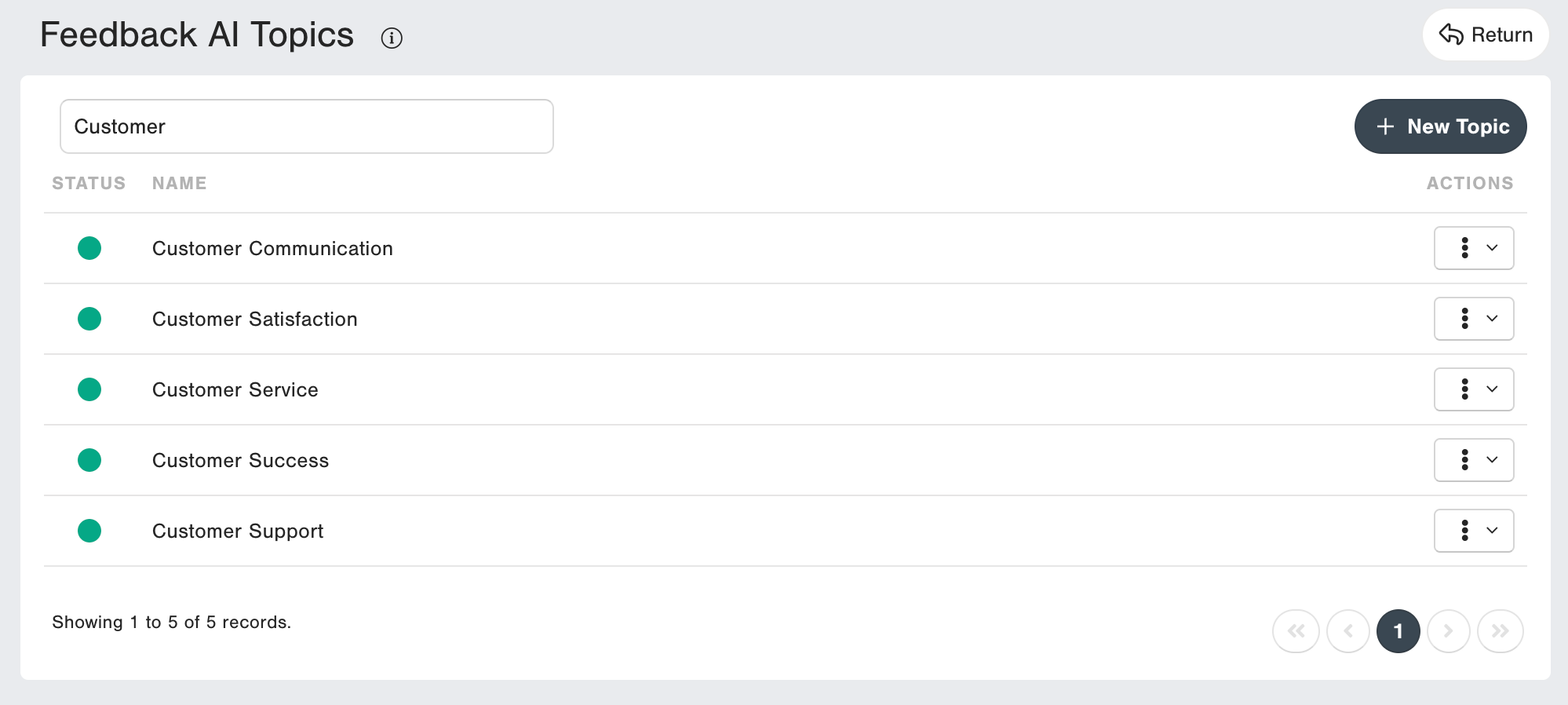 2. Keep it neutral. Feedback AI will determine the sentiment of the topic depending on the context. For example, a good Topic would be 'customer support', not 'customer support is good' or 'customer support should be better'.