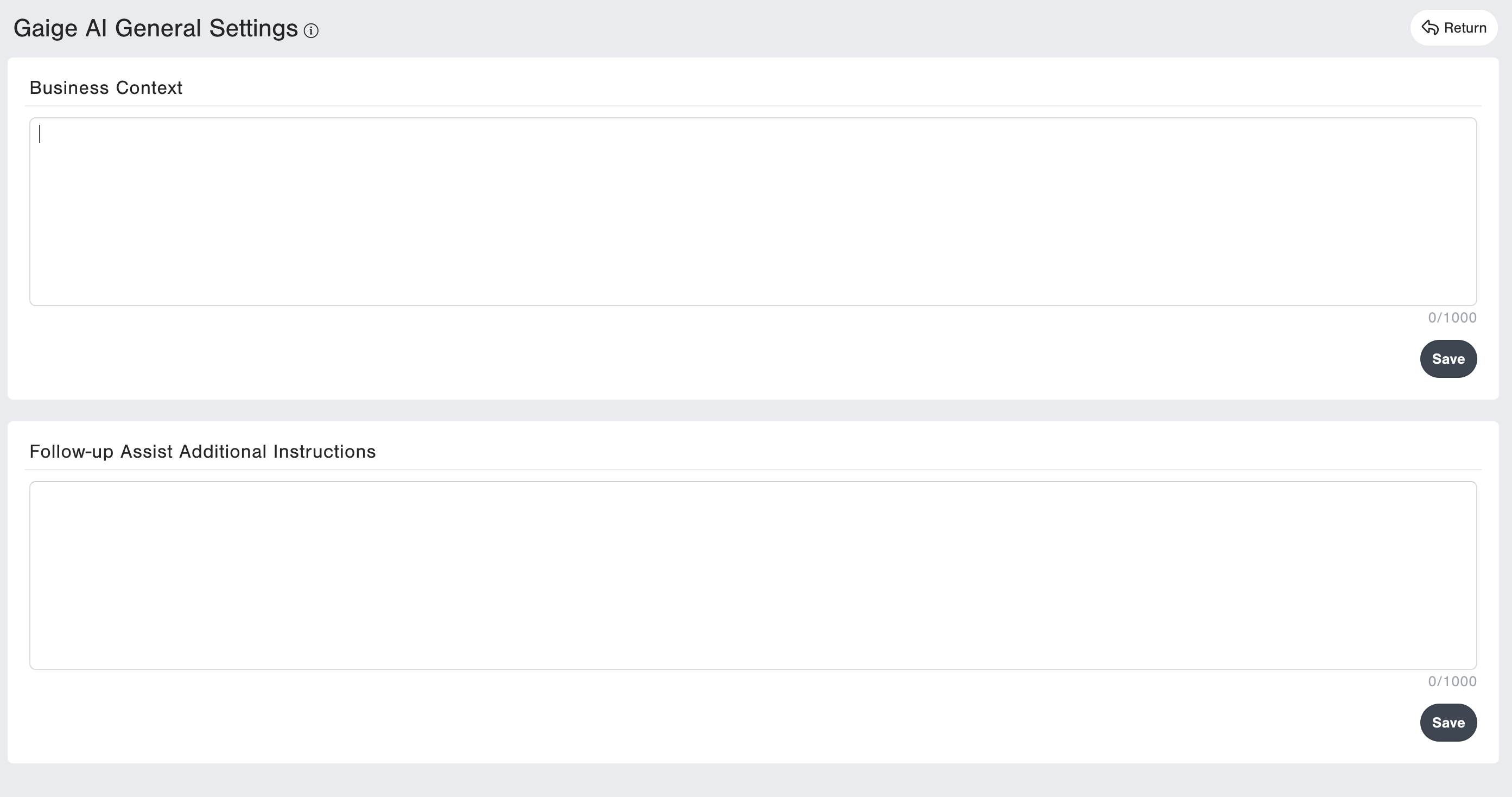 For Follow-up Assist: In this section, you can provide additional instructions for how you would like Gaige to generate the Follow-up suggestions it provides. This allows your messaging to be more personalized upon the initial creation of the suggestion. For example, if you prefer the messages to be generated using more friendly tone, or a more formal tone, or for providing it more context about your organization in general or your organization's processes for things like Closing the Loop and corresponding with customers.