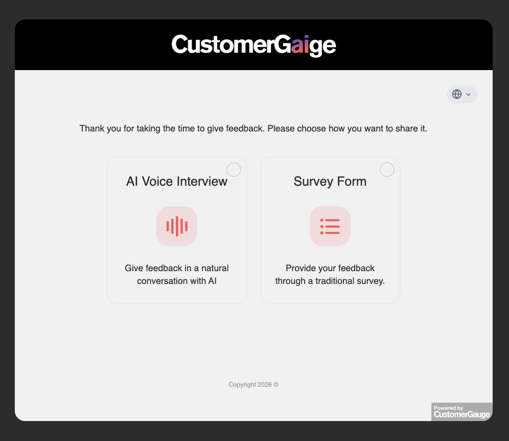 Customers with Gaige AI Credit packages can choose to leverage the AI Interview survey option for any of their Campaign Surveys. With Gaige AI Interview Surveys, respondents can have a live interview by voice with Gaige, being able to share their feedback as if they were talking to a human representative. The respondents would still have the option of completing the survey via a traditional feedback form if preferred instead, even when this feature is activated. AI Interview invitations get delivered through the usual delivery vectors for Campaign Surveys: Email, SMS, WhatsApp, Personal Links.