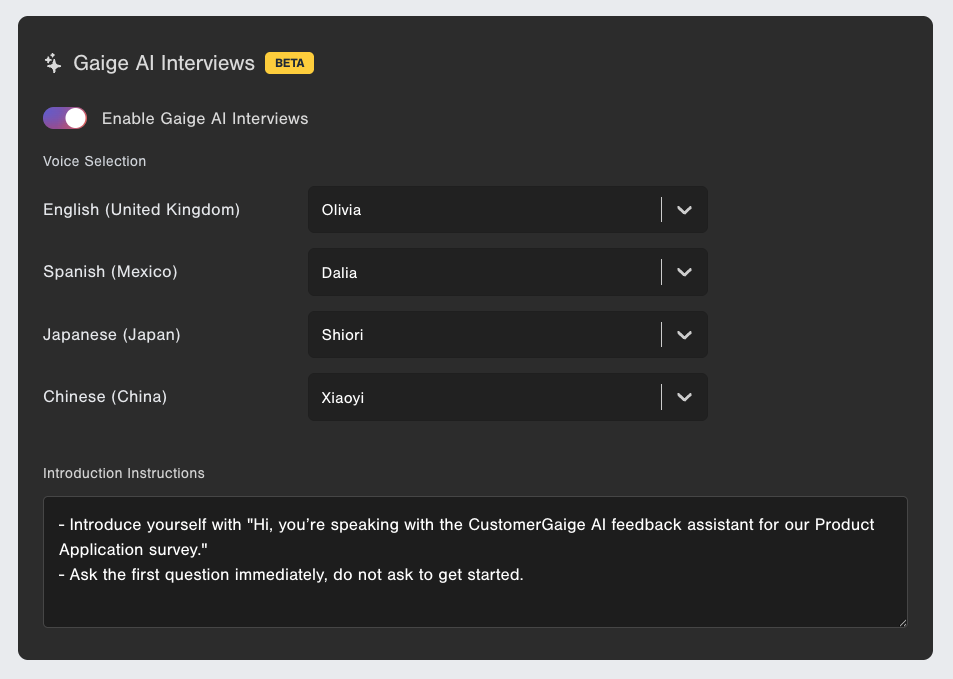 - (Optional) Add additional "Introduction Instructions" to guide the opening frame of the survey when the AI interviewer begins speaking to your survey respondent.