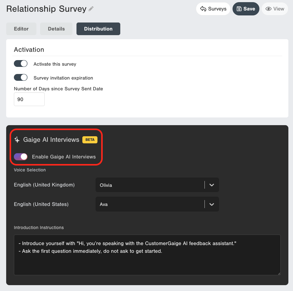 - The AI Interview survey option is only available for Campaign Surveys at this time.
