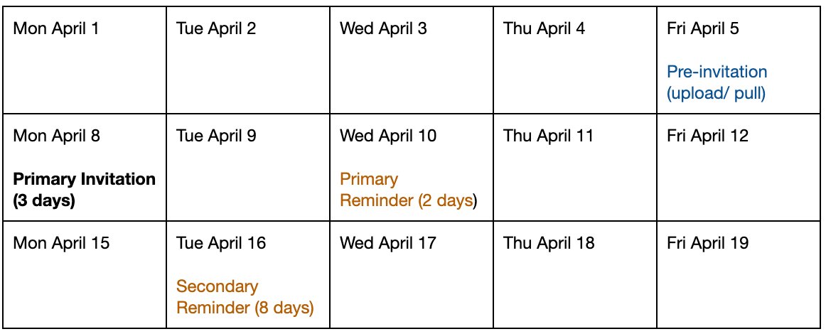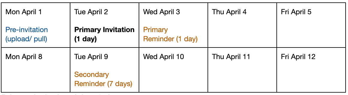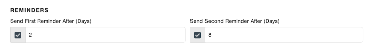 The number of days shown is the number of days since the primary invitation was sent (e.g., if the primary reminder is for 2 days and the secondary reminder is for 8 days, the second reminder will arrive 8 days after the primary invitation. That is, it arrives 6 days after the primary reminder.)